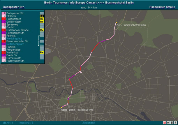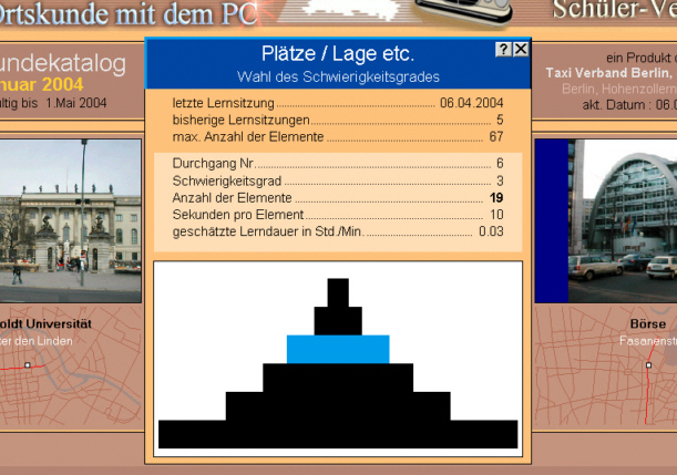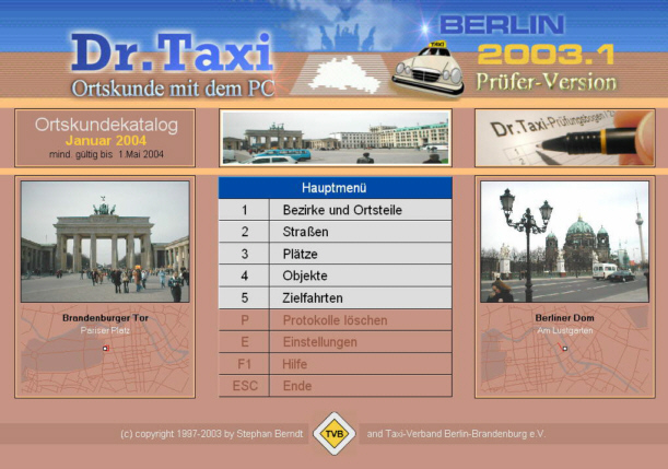 Allgemeines Dr.Taxi-Berlin ist ein Ortskunde-Schulungs- Programm für zukünftige Berliner Taxifahrer und wurde in Zusammenarbeit des Ex-Taxifahrers S.Berndt und dem TVB (Taxiverband Berlin, Brandenburg e.V.) entwickelt. Dr.Taxi wurde entwickelt, um schneller, mit mehr Spaß und sicherer den Stoff für die Ortskunde-Prüfung zu erlernen. Das Programm wurde vom Inhalt und dem Aufbau her speziell auf den Prüfungsstoff der Ortskunde abgestimmt, und wird laufen aktualisiert, also dem aktuellen Prüfungsstoff angepasst. Das Programm enthält einen frei skalierbaren Stadtplan Berlins, der zwecks Vereinfachung und Überschaubarkeit auf jene Straßen Berlins reduziert ist, die für die Prüfung erforderlich sind. (rund 1400 Straßen). Dieser Stadtplan ist auf fast allen Lernebenen vorhanden und zeigt die jeweilig zu lernenden Elemente automatisch an, so dass insbesondere bei Anfängern lästige und zeitraubende Suchereien in einem gedruckten Stadtplan entfallen. |