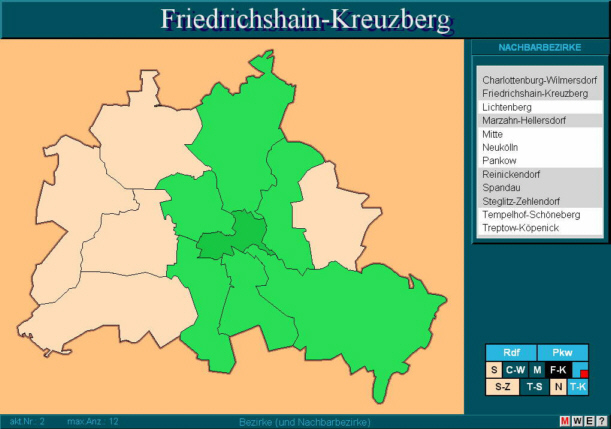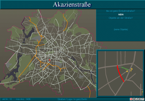Auf dieser Ebene werden sämtliche für die Ortskunde wichtige Straßen abgefragt. Man kann die Auswahl aber auch auf die einzelnen Bezirke eingrenzen. |