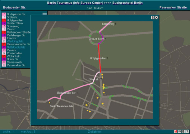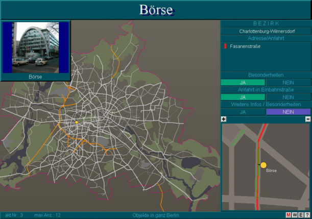 Fahrtziele bzw. "Objekte" In der Ortskunde-Prüfung wird verlangt, dass man bei etwa über 400 Fahrtzielen weiß, in welchem Bezirk sie liegen, welche Adresse sie haben, und wo an der jeweiligen "Adressen-Straße" sie liegen, bzw. wo genau im Stadtplan. Teilweise gibt es dann noch Besonderheiten zu beachten, die für die An- und/oder Abfahrt gelten. Alle diese Informationen werden auf der Lernebene rechts gelernt. Zu vielen Objekten gibt es in Dr.Taxi Fotos, die hin und wieder hilfreich sind, und wenn nicht (jeder weiß wohl, wie der Reichstag aussieht ...) den Lernvorgang etwas auflockern. In der kleinen Zoom-Karte rechts sehen Sie übrigens auch Einbahnstraßen-Zeichen. Leider ist das durch die Bildkompremierung etwas undeutlich geworden. In der Originalansicht sieht man jedoch, dass die Börse in einer Einbahnstraße liegt. |