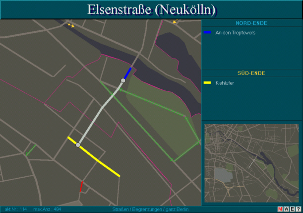 Straßen / Lage Auf dieser Ebene lernt man, wo die einzelnen Straßen im Stadtgebiet liegen. - Man drückt eine Taste, - der Straßennamen taucht auf, - man überlegt, wo sie liegt, - drückt eine Taste, - und sieht die Straße im Stadtplan rot markiert. (Etwa 1 cm links unterhalb der Kartenmitte) Gleichzeitig wird in der kleinen Karte rechts die nähere Umgebung der Straße angezeigt, plus wichtige Abbiegegebote und Einbahnstraßen.