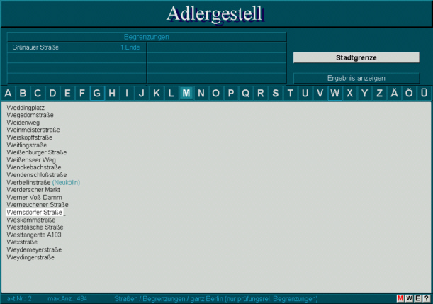 Straßen / Begrenzungen Texteingabe Hier wird das Gleiche gelernt, wie oben, nur ohne Unterstützung durch den Stadtplan. Man muss die richtigen "Begrenzungen" aus Listen mit Straßennamen heraussuchen. |